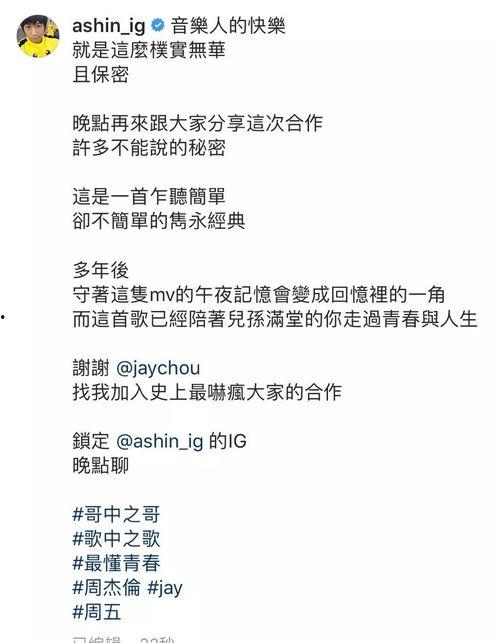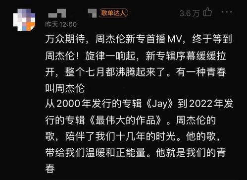 亲爱的音乐爱好者们,你们准备好了吗?今天,我要带你们一起揭开周杰伦新歌歌词的神秘面纱,一起感受这位音乐帝国的最新力作!最近,周杰伦新歌的歌词爆料视频在网上引起了热议,让我们一起来看看吧!